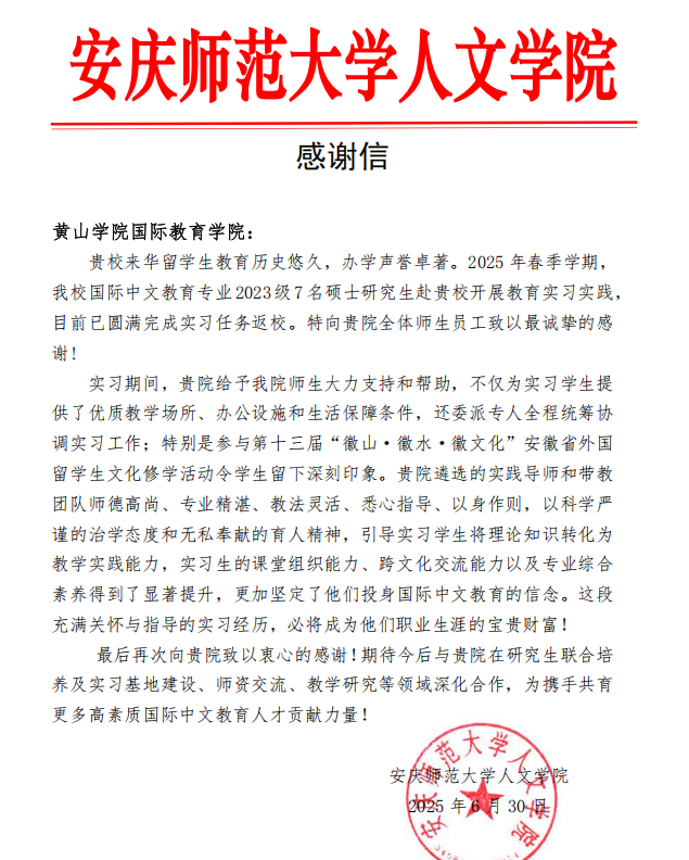 近日,安庆师范大学人文学院向我院发来感谢信,感谢我院在国际中文教育专业实习实践中给予的支持与帮助,对双方在国际中文教育人才培养领域的合作成果高度认可。