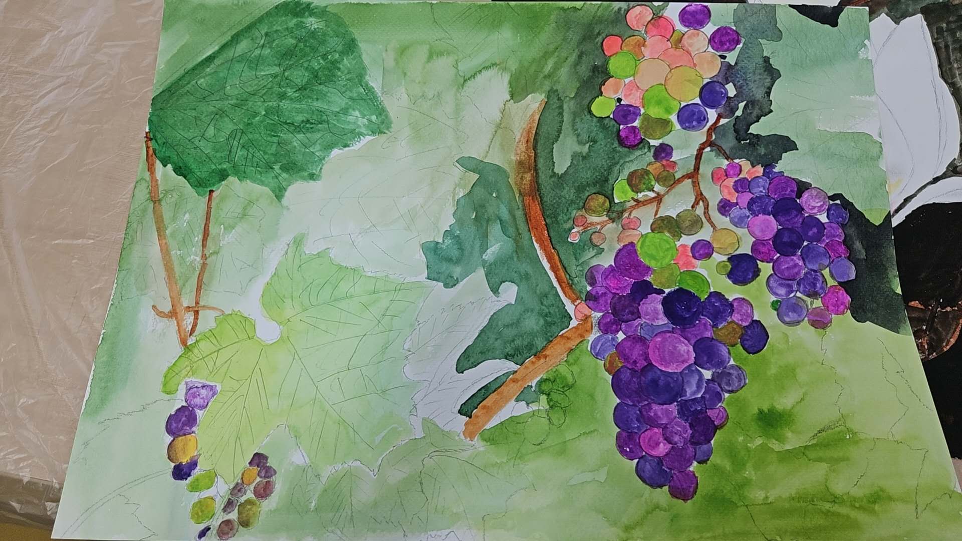 与此同时,我也积极参与了学校的美术社团活动。每周一次的社团课,不仅是我放松心情的好时光,更是提升审美、表达自我的平台。本月我学习了水粉画的基础技法,并完成了两幅作品:《葡萄》与《玉兰花》。葡萄的果实饱满、晶莹剔透,玉兰花的花瓣洁白、温婉动人,这些静物不仅锻炼了我的绘画技巧,也让我学会用心去观察生活中的细微之美。虽然只是初学者,但能亲手完成一幅幅作品,让我无比自豪与满足。