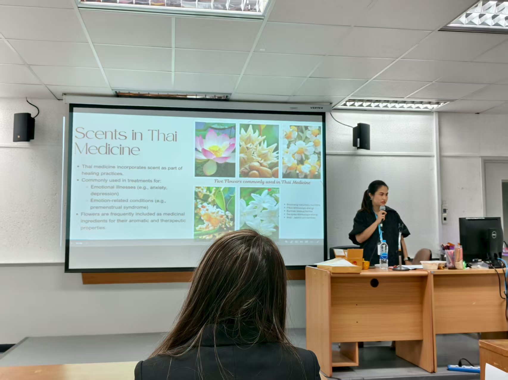 第一天上午是花卉课,老师教了我们三种荷花的折花方式。以这种轻松愉快的方式,我们渐渐融入了泰国艺术大学这个大家庭。在老师的鼓励下,我主动和不同国家的人沟通交流。面对全新的人和事物,我发现自己变得更加开放包容。同时,我也更加了解到各个国家的朋友,他们不同的表达方式和语言习惯。中午休息时,我和一位印度妹妹因为中国的影视剧结缘,她激动地向我表达自己有多爱中国的网剧,甚至比我看的都多。后来她成为了我在此次旅途中结交的一位好朋友,我们相互交换邮件,回国后依然保持着联络,向彼此分享日常生活。下午每个国家都依次进行了自我介绍和节目表演,我感受到了不同国家的异域风情。而我们的队伍身着特色旗袍,演唱了一首江南,收到了大家的喝彩欢呼。