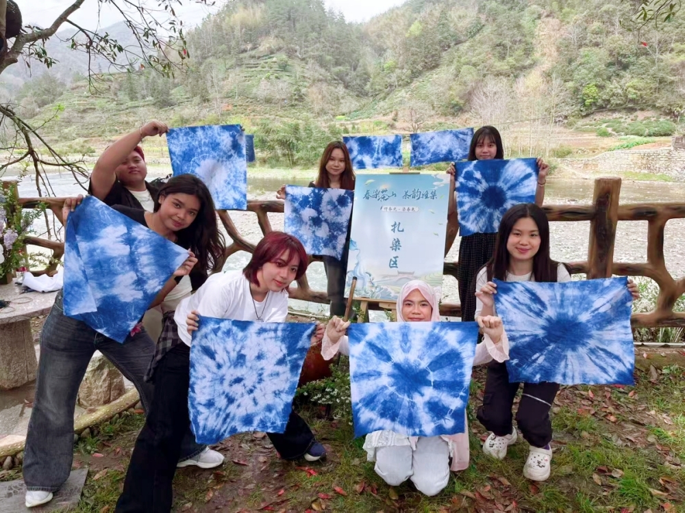 在非遗扎染体验环节,非遗传承人向留学生们详细介绍扎染的历史渊源与技艺精髓,手把手指导大家进行捆扎、染色、晾晒等操作。留学生们兴致高昂、认真实践,亲手制作属于自己的扎染布艺作品,在指尖的创意与实践中,近距离感受中国传统手工艺的匠心与韵味,留下了独特的文化记忆。