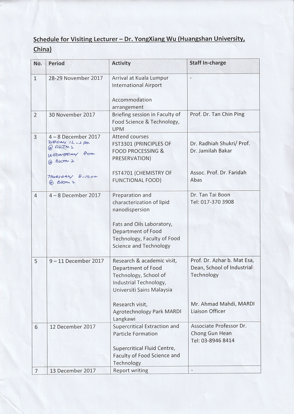 此次访学,在导师Tan Chin Ping教授以及自己的努力下,较快融入了博特拉大学的教学、科研及生活中,包括旁听课程,了解博特拉大学CDIO工程教育理念;参观相关的实验室及食品工程中心,学习创新应用型食品专业学生工程实践能力的培养;研究相关的科研项目,开展与马来西亚理科大学的学术交流,初步学习了纳米颗粒分散技术在食品及化妆品中的应用。同时,自己的英语也有了一定程度的长进。
