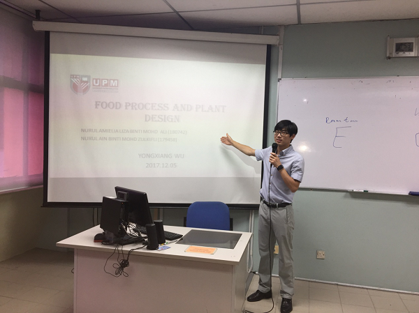 主要旁听了 Radhiah Shukri博士及Jamilah Bakar教授的《Principles of Food Process and Preservation》(食品加工与保藏原理)课程。博特拉大学采用了CDIO工程教育理念的教学方式,形成了具有特色和创新的教学内容与教学方法。CDIO (构思conceive、设计design、实现implement和运作operate)是工程教育的一种新型的教育模式。CDIO以产品研发到产品运行的整个生命周期为载体,通过产品化的项目设计将课程知识体系之间有机联系起来,让学生自发地进行课程实践,在一定程度上,能够充分激发学生的学习兴趣,较好的解决应用型本科教育中理论和实践脱节的问题。