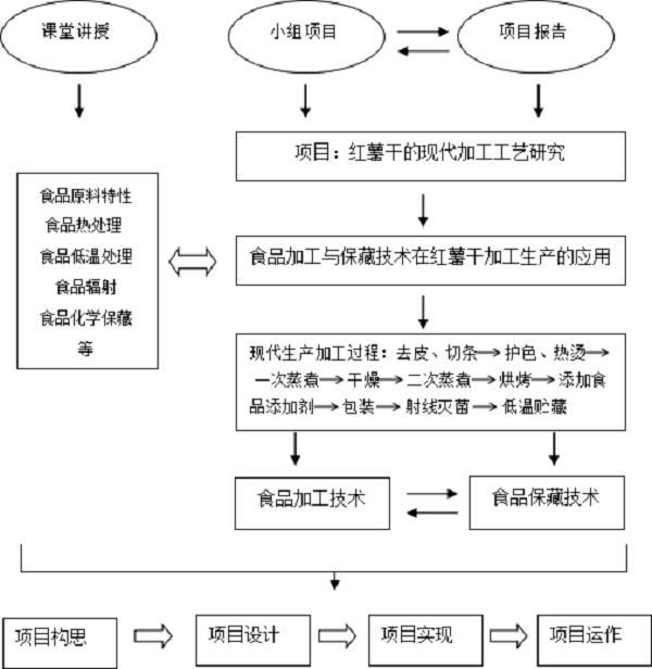 图1 CDIO理念下,以项目“红薯干的现代加工工艺研究”为核心的《食品加工与保藏原理》教学内容