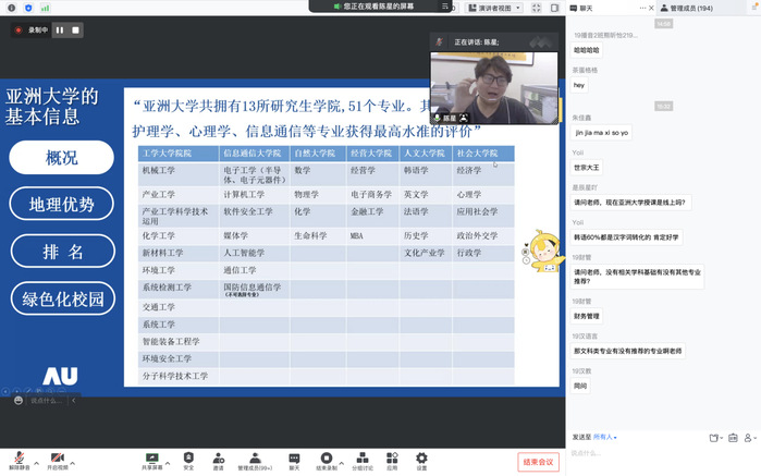 4月20日,英国上市公司365举办韩国亚洲大学硕士研究生线上招生宣讲会,邀请韩国亚洲大学驻中国联络办公室主任陈星担任主讲,外事办工作人员和两百余名在校生参加了宣讲会。