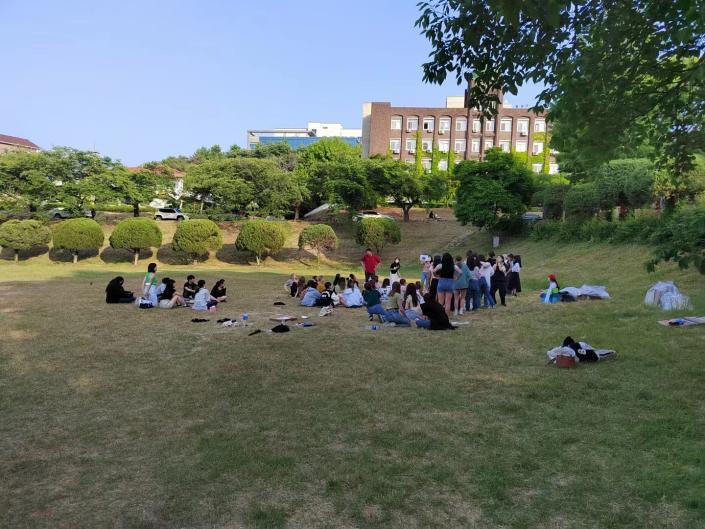 6.2今天是交换生的最后一次派对了,来自各国的交换生被分成6个队伍,先是围坐在一起分享了一顿晚餐,这顿晚餐虽然只有披萨,但是最重要的是和各国的交换生在一起的那个氛围。之后我们在围坐一起的那个草坪上进行了好多场的游戏。最后被带到了艺术中心去看电影,那天下午的时光是短暂而又让人流连忘返的。