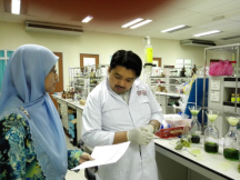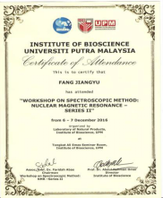 2、 每周一到周三,派往生物科学研究所天然产物实验室,现场观摩了天然产物分离、提取、化学合成、核磁共振、高效液相色谱、生物测定等技术。期间,与实验室研究人员就茶叶与油棕中次生代谢问题交换了双方的研究成果与领域研究进展。参与到实验定期与不定期的研究汇报会,与实验室硕士生与博士生讨论他们的试验,提出建议与意见。获得UPM核磁共振培训结业证书。