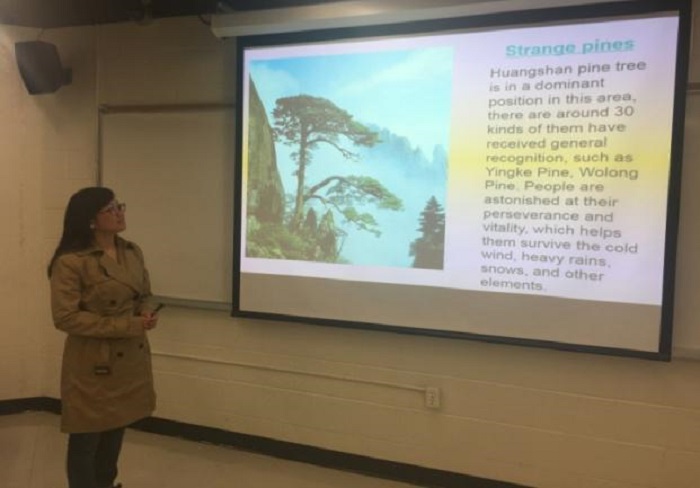 我还在外语角和听课班级就课题研究所进行的反思进行了简要汇报,也以徽州、黄山和名著《红楼梦》为主要内容,和大家进行了一些简单的介绍和交流