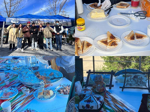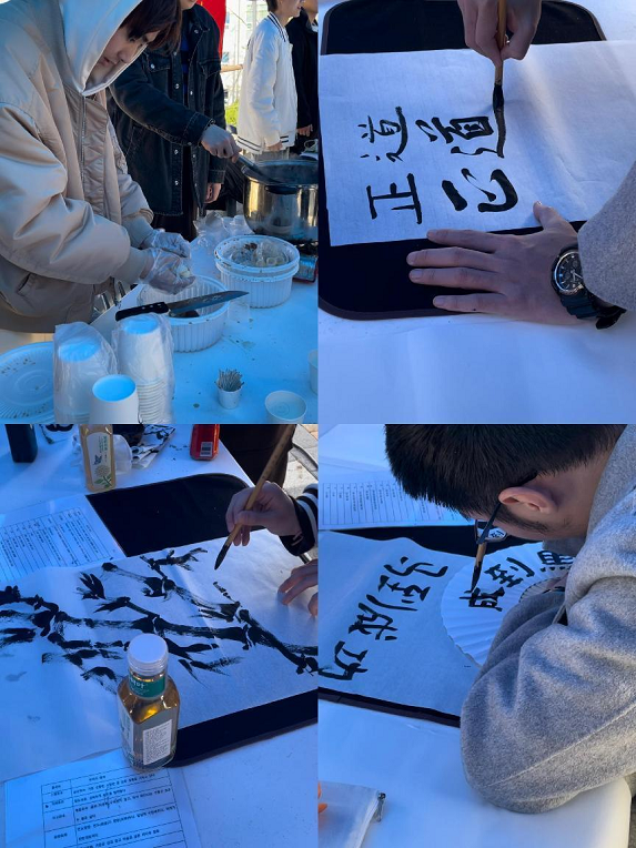 学校每年的11月份都会有“全球日”活动,这是留学生最大的活动,每个国家会有一个摊位,在摊位上展示自己国家的饮食和游戏。今年学长带着我们一起做茶叶蛋,游戏我们选择了书法,我们会让他们先自己写,之后再由会书法的学长写一份赠送给他们,韩国同学最喜欢写的两个字是“人和”。比较意外的是,书法在外国同学中非常受欢迎,很多同学会自己查中文,写一些比较复杂的汉字。在活动中我们还品尝到了很多国外的美食,比如印度的手抓饭,法国的小面包,越南的菠萝蜜,还和越南同学一起踢毽子,扔飞镖,体验了各个国家的文化。