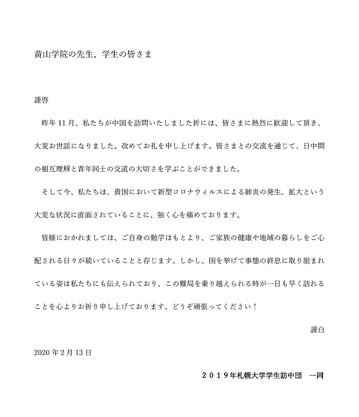 札幌大学学生访华团首先对在访问中国期间受到了我校的热烈欢迎和关照表示感谢,认为此次访问让他们进一步意识到了中日之间的相互理解以及青少年之间交流的重要性。他们对于我国疫情的发生以及蔓延的严峻形势表示关心,对我国此时正举国上下为控制疫情而在努力奋斗表示赞赏,并衷心祝福疫情尽快散去,早日拨云见日。