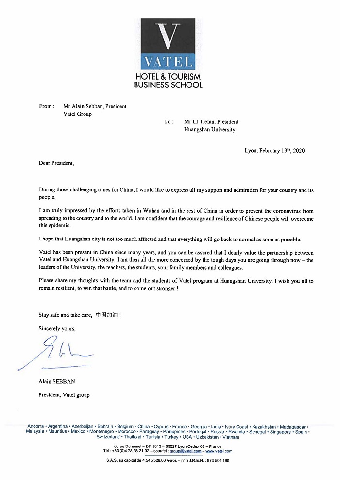近日,法国瓦岱勒旅游与酒店管理商学院主席塞班先生和日本札幌大学2019年札幌大学学生访华团分别给我校发来友好信函,表达对疫情防控的关心和对我校师生的问候和祝福。