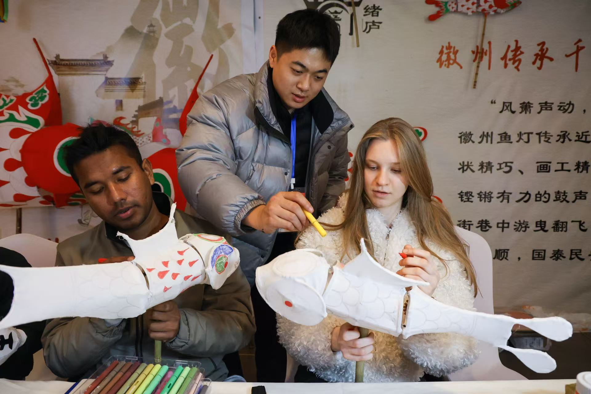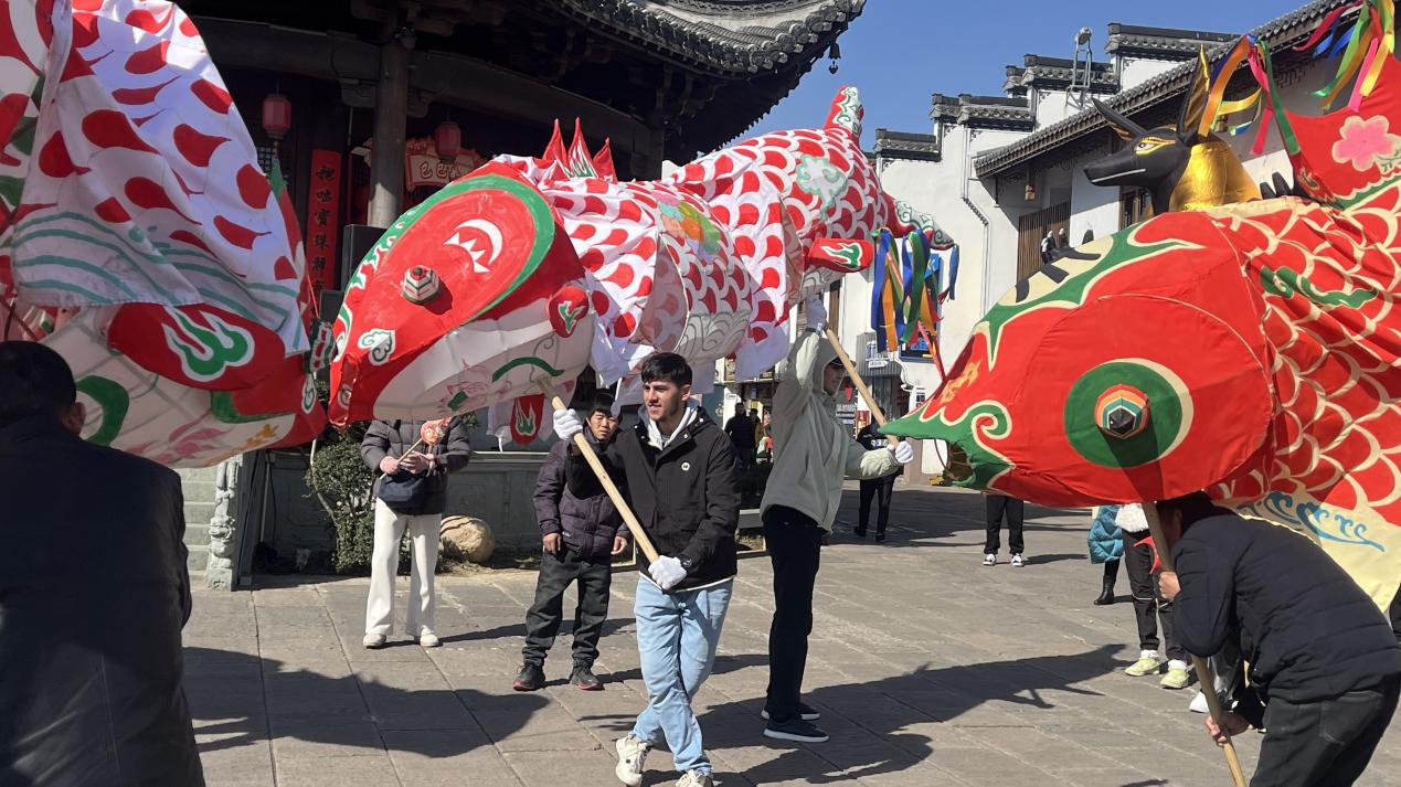 在非遗师傅的悉心指导下,留学生们迅速掌握了舞鱼步伐、翻飞打滚、斗鱼等高难度技能。塔吉克斯坦留学生拉乌负责鱼头的控制,他激动地说:“我在网上看过鱼灯表演,一直想亲自尝试,这次体验真是太棒了!”而来自蒙古国的星星则对鱼灯背后的文化含义情有独钟。她表示,通过学习了解到“鱼”在中国文化中象征着“年年有余”,舞动鱼灯不仅是对新年的美好祝福,更是对自身文化收获的期许。她希望在新的一年里能深入学习更多中国文化,并将其传播到世界各地。