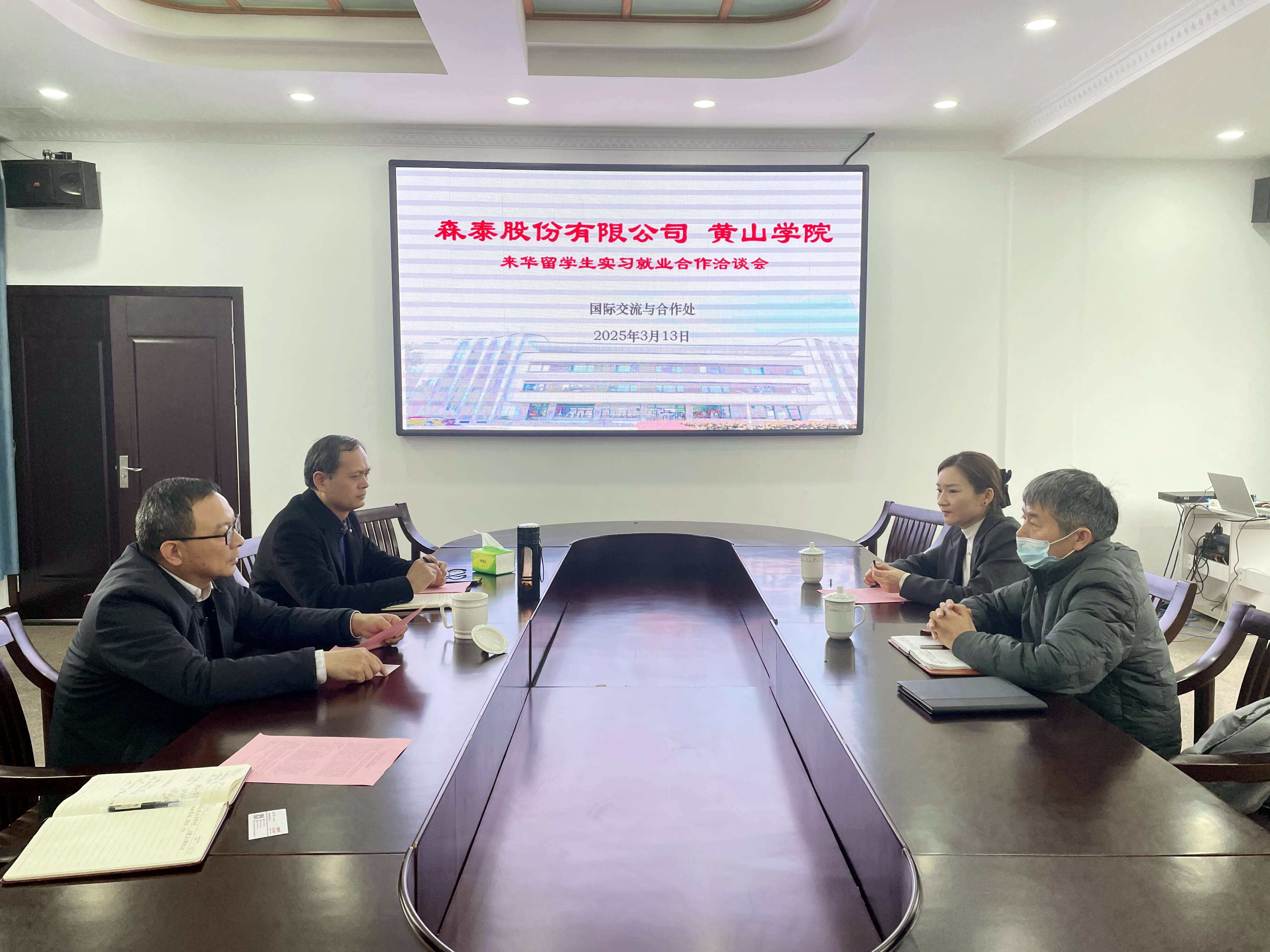 3月13日,安徽森泰木塑集团有限公司人力资源总监赵文书、经理胡庆兰来校洽谈来华留学生实习就业、校企合作相关事宜。国际交流与合作处处长李庆玖和留学生管理相关人员参加座谈交流。
